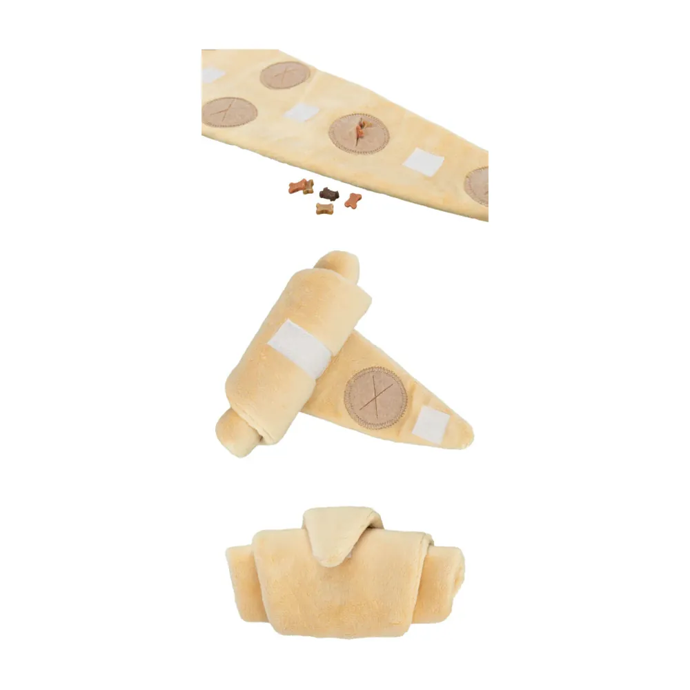 Als Spielvorbereitung wird das entrollte Croissant mit Leckerlis oder Trockenfutterkroketten bestückt. Diese können in den aufgenähten, runden Fächern verstaut werden. Anschließend wird das Snackspielzeug von der breiten zur schmalen Seite hin aufgerollt, sodass die Fächer mit den Snacks innen liegen. Damit es sich nicht von selbst entrollt, ist ein Klettverschluss eingearbeitet.